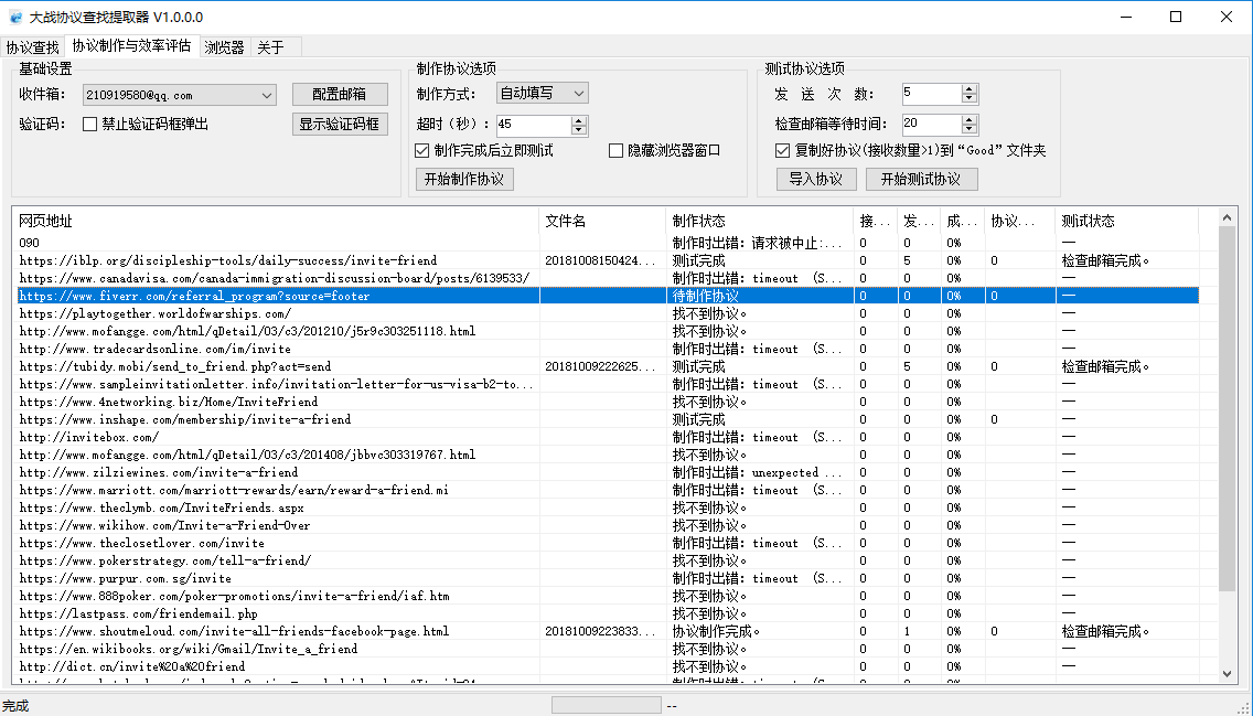 2、自动抓取协议,完成后可以自动测试(如果有协议),电子邮件表单可以自动填写,也可以手动填写。系统自动识别验证码地址,表单中的参数,可自动生成协议文件。